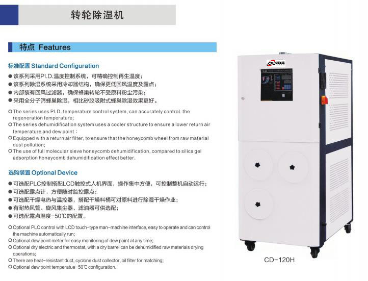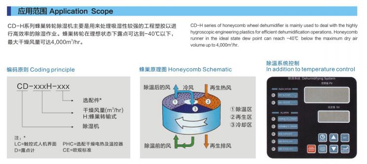該系列采用PI.D.溫度控制系統,可精確控制再生溫度; 該系列除濕系統采用冷卻器結構,確保更低回風溫度及露點;內部裝有回風過濾器,確保蜂巢轉輪不受原料粉塵污染;采用全分子篩蜂巢除濕,相比矽膠吸附式蜂巢除濕效果更好。